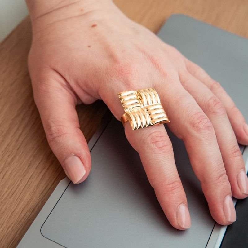 O anel quadrado é pura expressão e movimento. Suas curvas fluidas e acabamento dourado intenso criam um efeito escultural nas mãos. Uma peça que traz confiança e autenticidade, feita para quem ama acessórios com personalidade.
