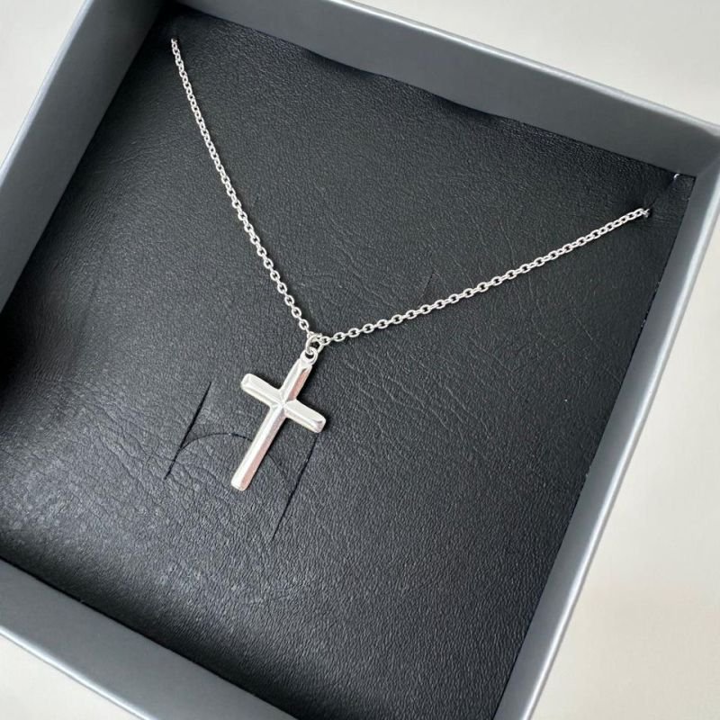 Dados técnicos: 70cm de comprimento, 1mm de espessura da corrente. Crucifixo de 2,5cm de altura e largura de 1,5cm.